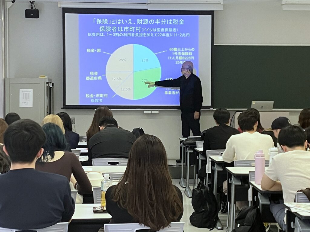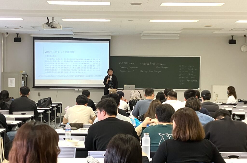 浅川氏は、深刻化する社会構造の変化と財源の逼迫や、危機的な「担い手不足」にも触れ、日本の介護制度の根幹にある考え方と、それに伴う現実的な課題について話し、学生たちは真剣な表情で聞き入っていました。