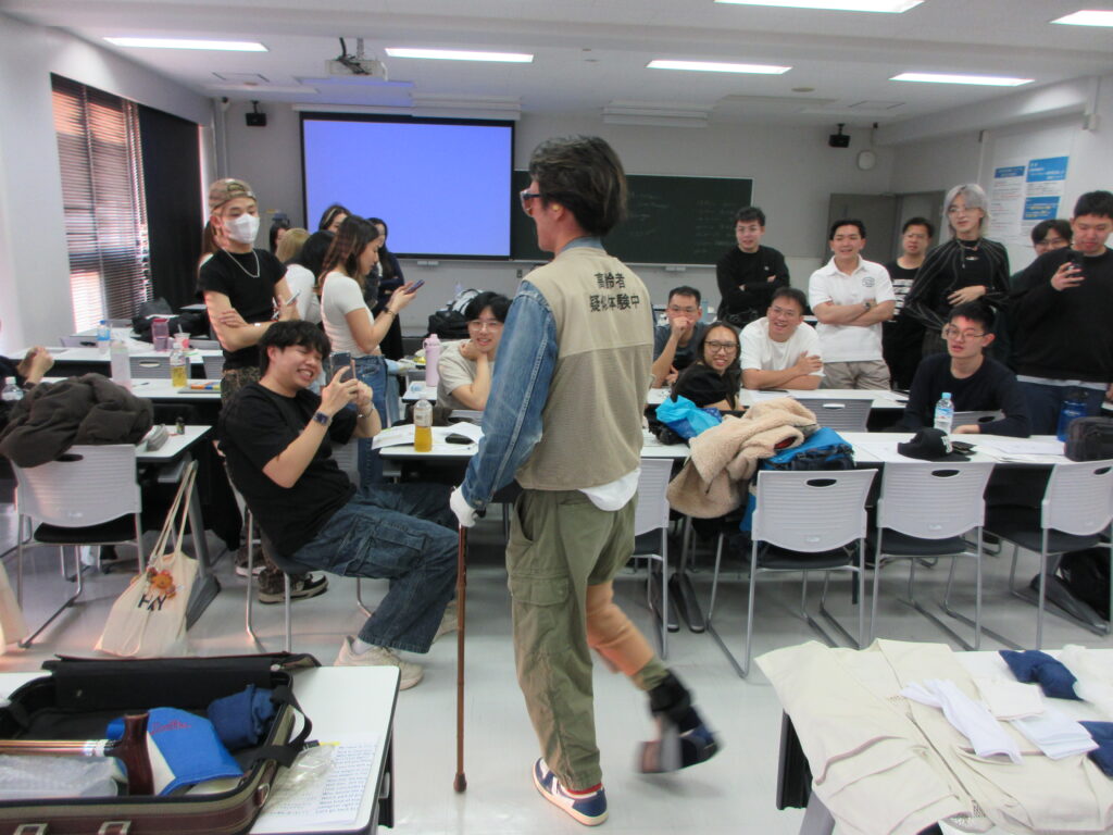 最後のプログラムは、「高齢者疑似体験」でした。学生全員が疑似体験をすることができ、高齢者の身体的な制約を実感しました。