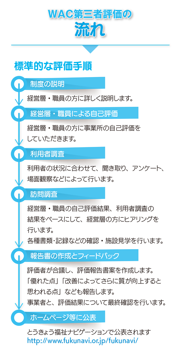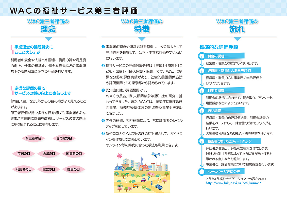 WACは、第三者評価制度が持つ多様な目を通じて、事業者が自主的に課題改善、サービスの質の向上に取り組まれることに寄与します。