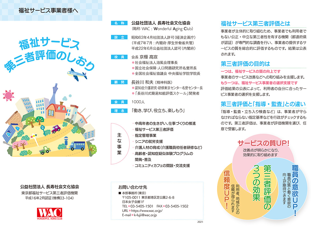 WACは公益社団法人として、評価を通じて得られた事業者、利用者、職員の方などの声を、”人間的なふれあいのある長寿社会”を作るための提言につなげます。