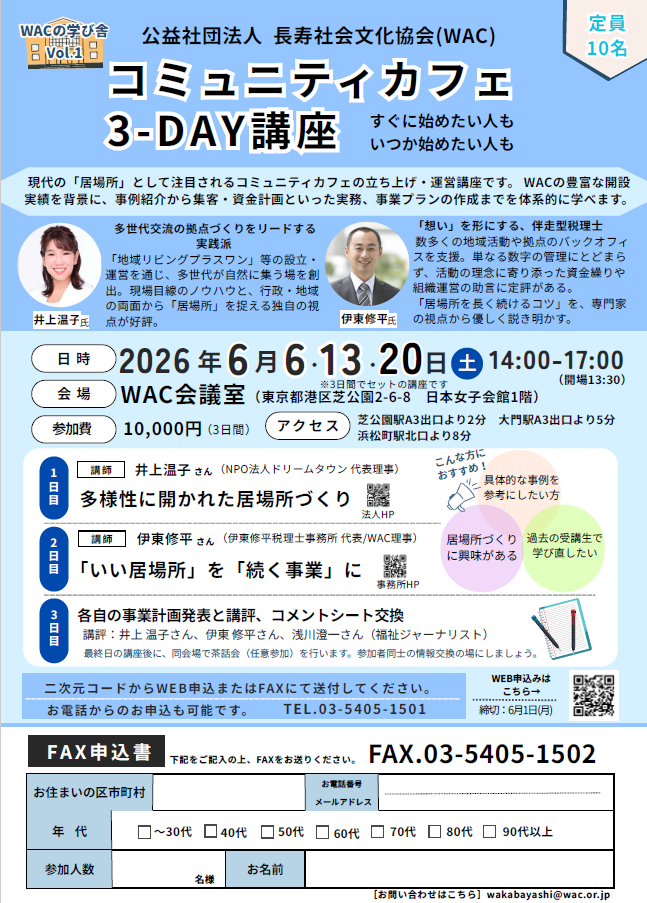 本講座は、WAC(公益社団法人 長寿社会文化協会)の豊富な実績をベースに、事例紹介から集客・資金計画、そして自分自身の事業プラン作成までを体系的に学べる3日間です 。
