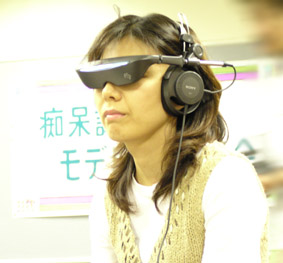 できるだけ周囲の騒音や様子が気にならないよう、体験者はヘッドフォンとヘッドマウントディスプレイを装着し、映像と音声で認知症高齢者の気持ちや行動を疑似体験します。