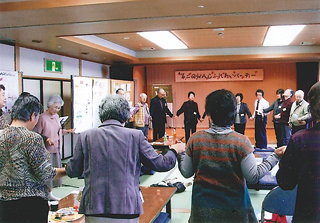 - 事務局では前年に引き続き、仙台市若林区のみなし仮設住宅で地域コミュニティづくりのために、高齢者に焦点を当てて支援活動を行った。まず、食事面での健康づくりを目的に、調理師免許を持つ会員が中心となって、自宅にある余った食材で簡単に出来るサラダや煮物を作ったり、自宅にいる時間が長く、運動不足になりがちな高齢者のために、自宅でも簡単にできるマッサージやいすに座ってできる簡単な運動を教えた。そのほか、会員有志で毎月1回読書会を行い、毎回10人前後が参加している。