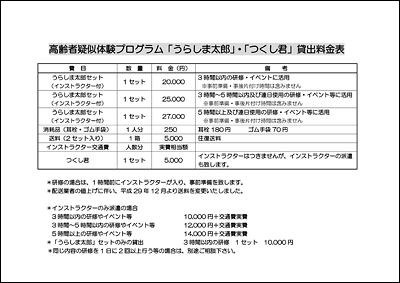 行政、社会福祉協議会、企業等が実施する介護講座や研修会、小学校・中学校での体験学習、その他福祉祭りなどの各種イベント、高齢者にやさしい街づくり、商品・サービスの開発、環境作りなどに活用できます。